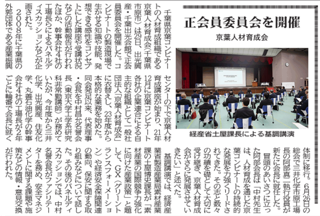 2025年10月30日付の化学工業日報に京葉人材育成会 正会員委員会の開催記事が掲載されました。